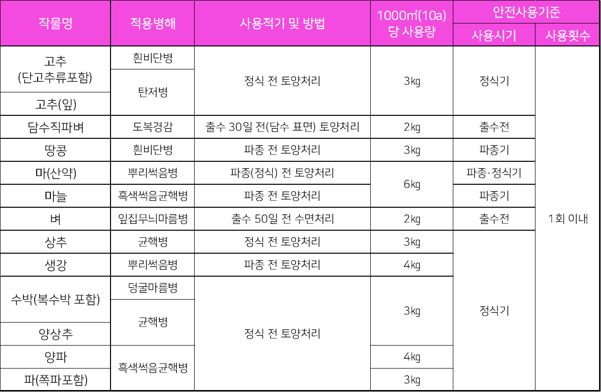 - 고추 : 장마기 또는 탄저병 다발생 시 반드시 전문약제를 추가로 살포 하십시오.