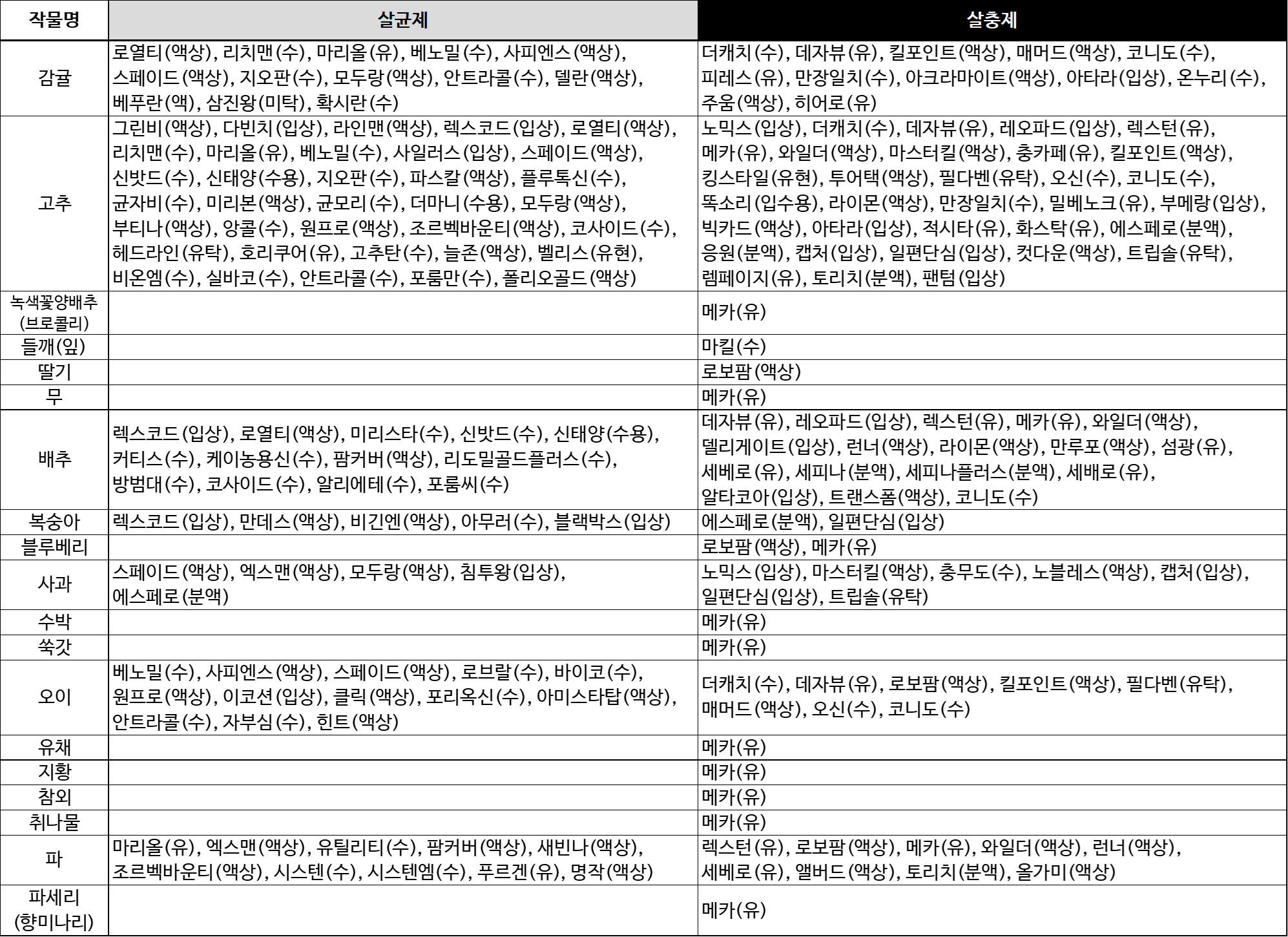 오미자 | 버찌가는잎말이나방 | 발생초기 경엽처리 | 3.4g | 수확 7일 전 | 2회 이내 |
