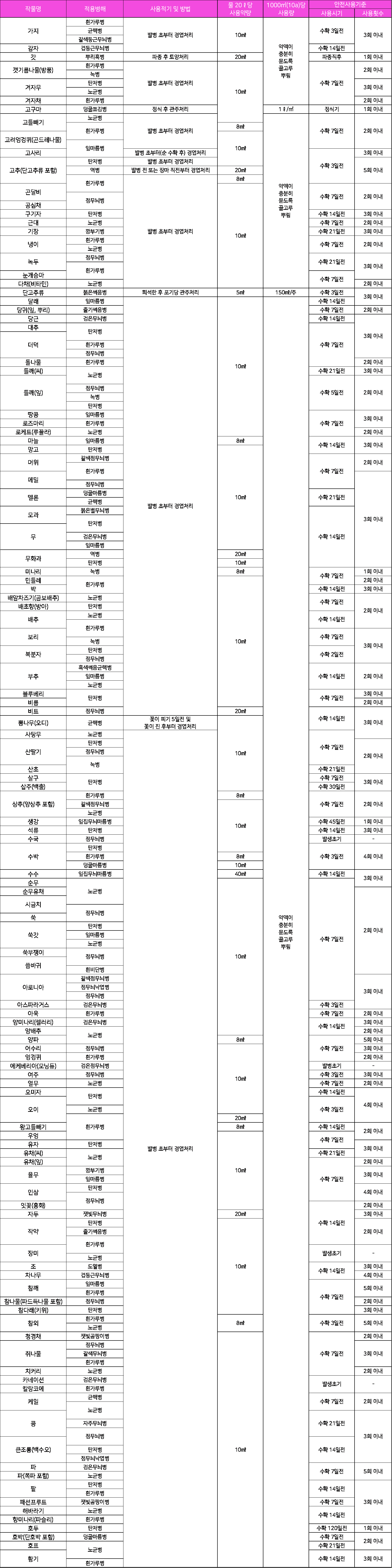 - 이 약제는 침투성이 빠르므로 전착제류나 침투 촉진제 등과 혼용 시 약해가 발생할 수 있습니다.