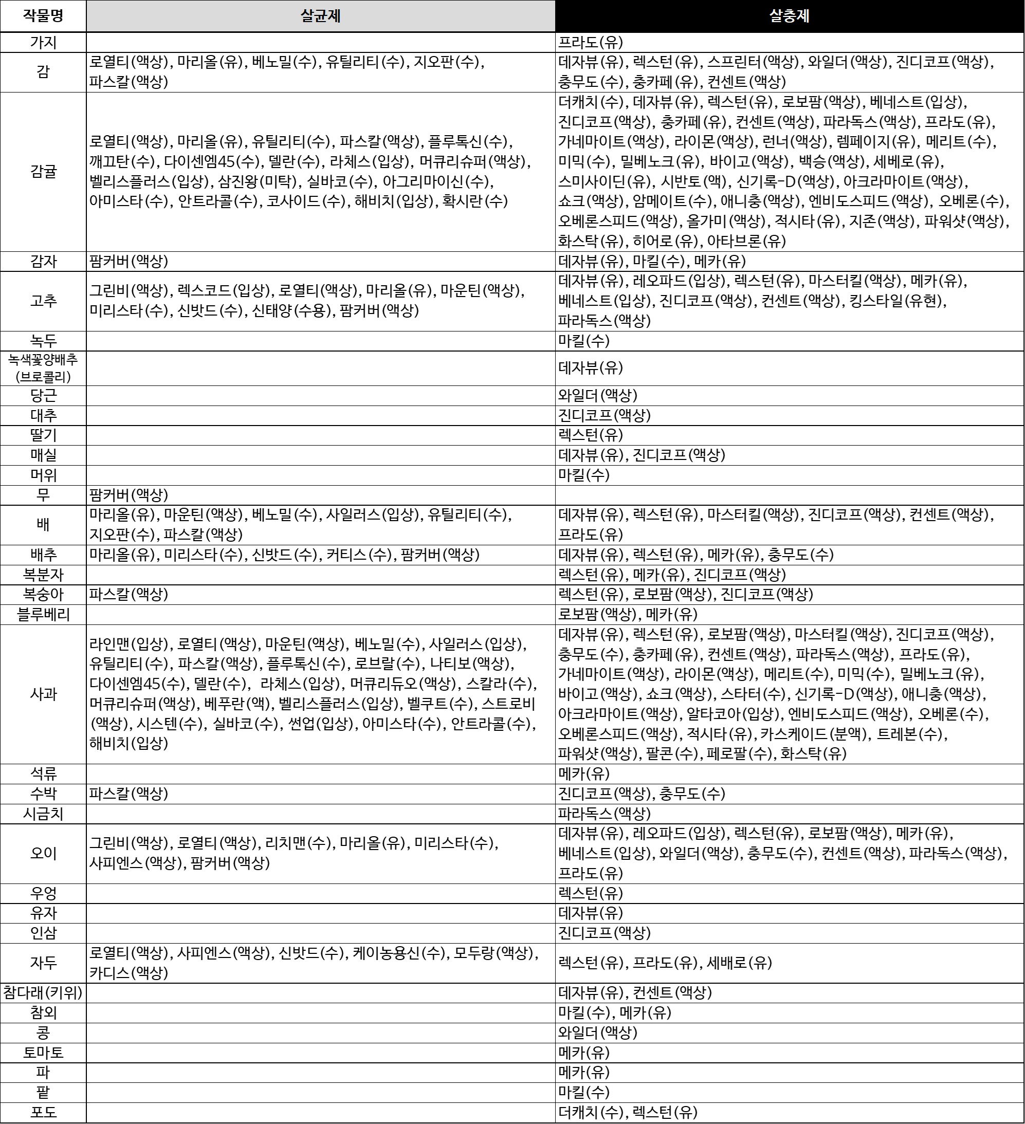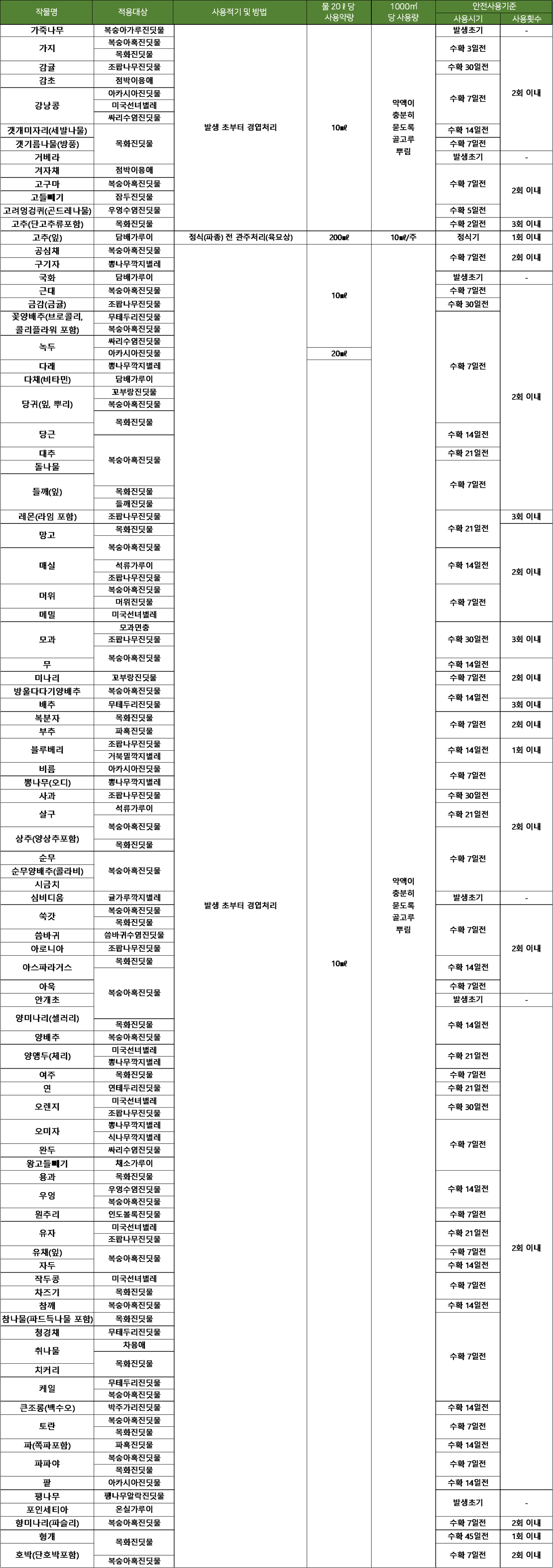 - 과수 및 채소에서 발생하는 다양한 흡즙성 해충(진딧물, 깍지벌레, 응애, 가루이 등)을 동시에 방제할 수 있습니다.