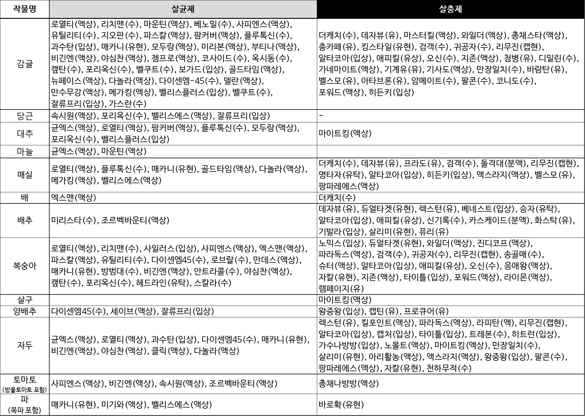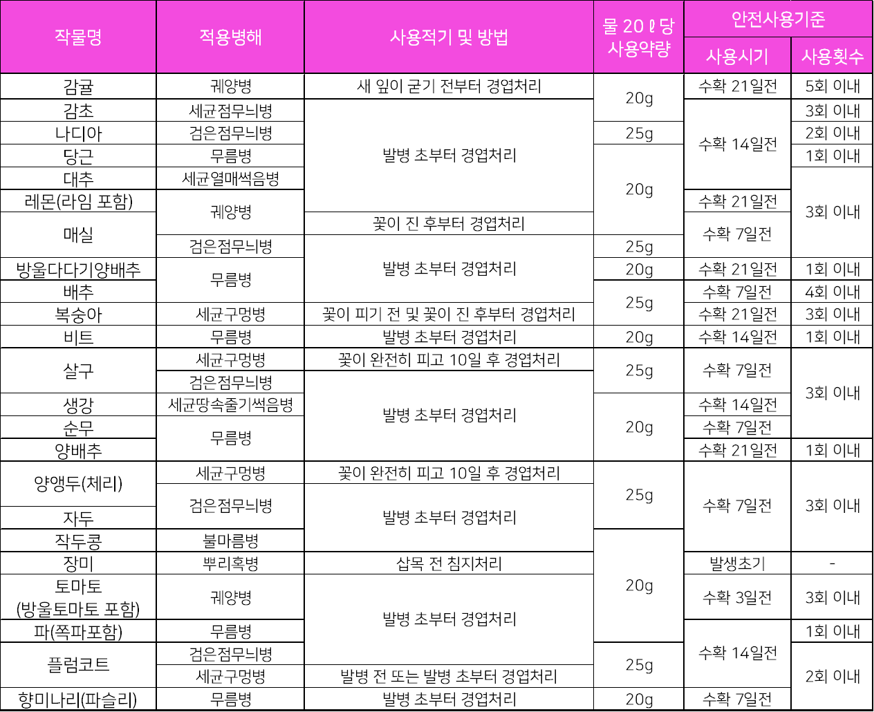 - 배추의 유묘기와 고온기에 사용하며 약해 발생 우려가 있으니 사용하지 마십시오.