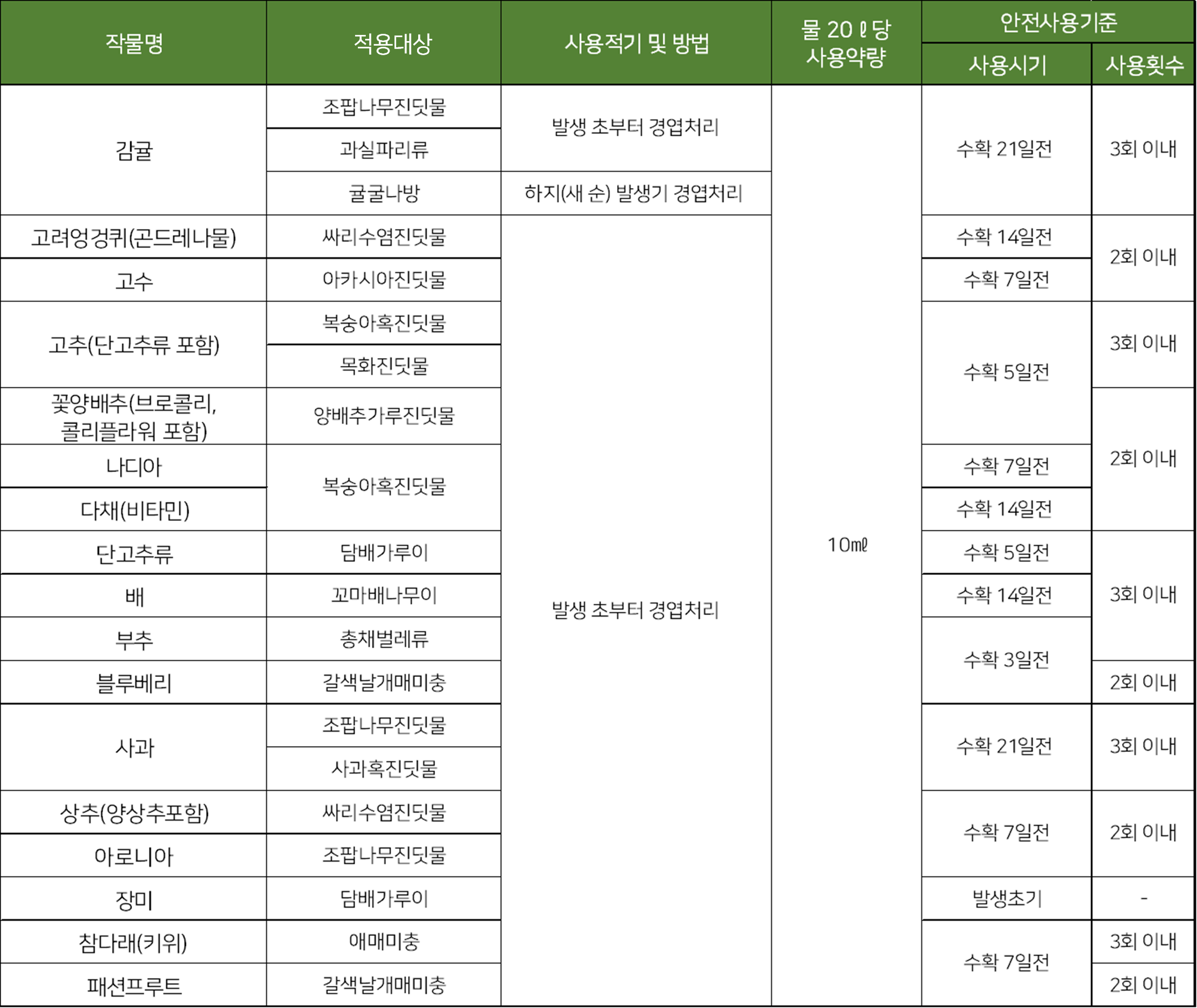 - 이 약제는 꿀벌에 잔류 독성이 강하여 봄부터 꽃이 완전히 질 때까지는 사용하지 말아야 하며, 일시에 광범위한 지역에 살포하지 마십시오.