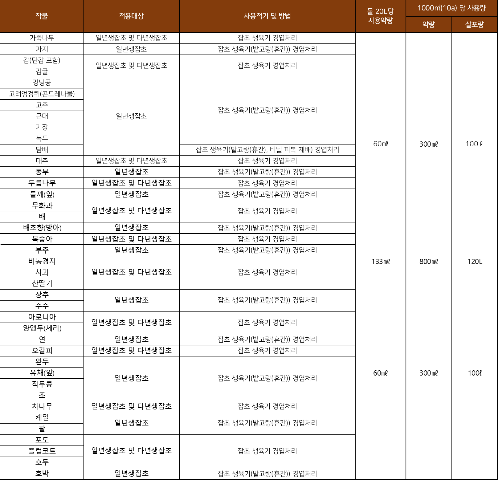 - 잡초가 20~30㎝ 정도로 자랐을 때 뿌리면 가장 효과적이며 잡초가 30㎝이상 커지거나 발생밀도가 높을 경우 살포량을 증가하여 살포하십시오.